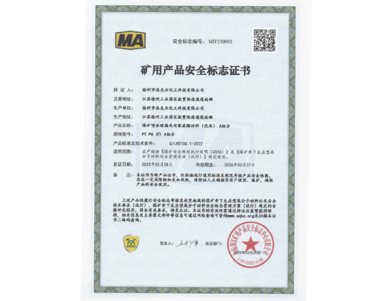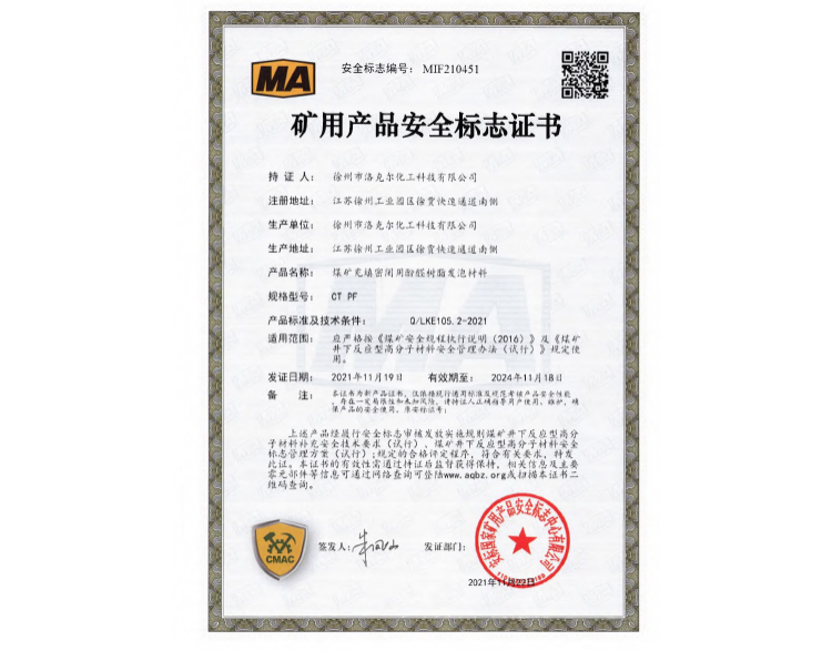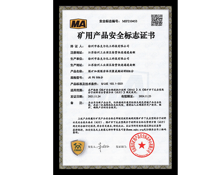 煤矿加固煤岩体用聚氨酯材料安标证书